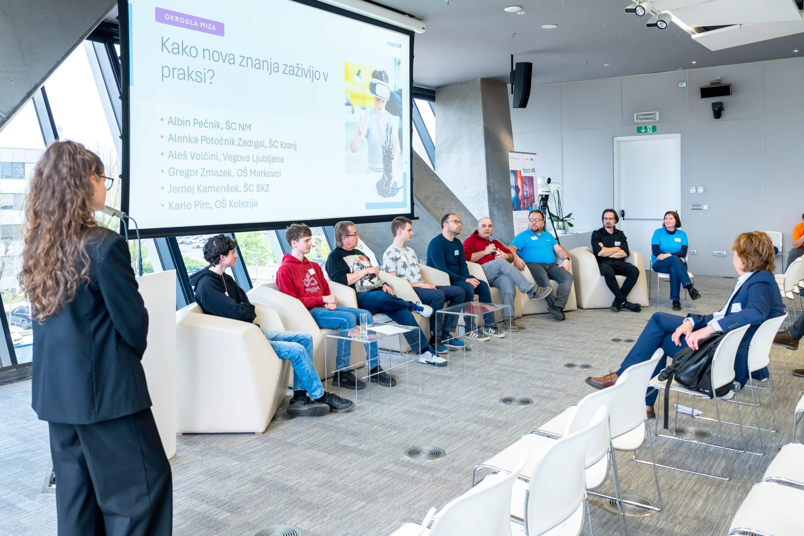 V tretjem delu so v ospredje stopili dijaki in mentorji, ki XR tehnologije že aktivno uporabljajo v praksi. Dijaki iz Šolski center Novo mesto, Šolski center Slovenske Konjice-Zreče in Vegova Ljubljana so predstavili svoje XR projekte, izzive pri razvoju ter osebne izkušnje. Na zaključni okrogli mizi so se jim pridružili tudi mentorji in učitelji iz Osnovna šola Kolezija, Osnovna šola Markovci, Vegova Ljubljana, Šolski center Novo mesto, Šolski center Slovenske Konjice-Zreče in Šolski center Kranj. Razprava je bila dinamična in iskrena – od izpostavljenih prednosti XR, kot so bolj nazorni prikazi kompleksnih vsebin in večja vključenost učencev, do realnih izzivov, kot so časovna obremenitev učiteljev in prilagajanje učnih načrtov.